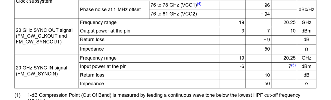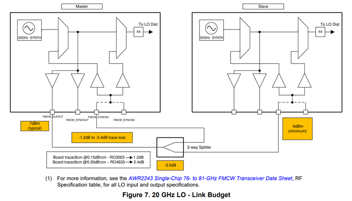(1)您好,按照AWR2243规格书里介绍的,20GHz LO信号功率典型值应该为7dBm,最大值有10dBm,如下图: