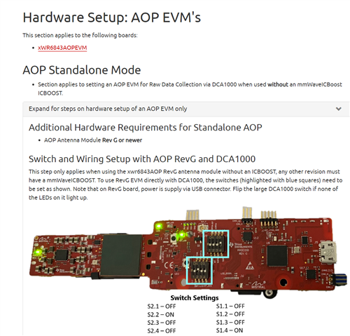 建议先按照下面hardware setup运行一下OOB demo,看一下单独使用IWR6843AOPEVM是否有问题。