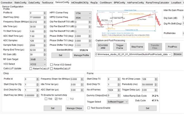 专家你好,我想利用DCA1000+1642进行原始数据采集,但得到的数据中存在着大量数据丢失的情况。以下是我的配置过程和参数。