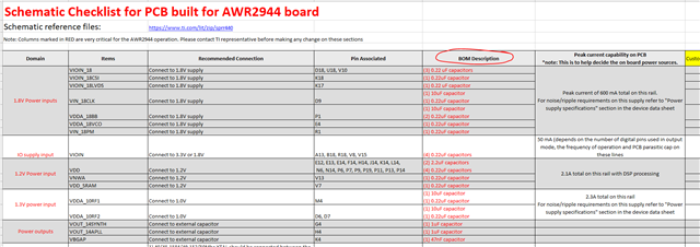 不过在测试纹波之前,可以参考 AWR2944 Hardware Design Checklist里的SCH_checklist选项卡, 列出了管脚的相关参考建议。
