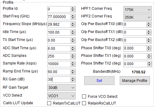 • 我拿iwr1642和dca1000测得了一组原始数据,我想根据“总损耗=TX发射功率+TX发射增益+RX接收增益—RX接收功率”来分析损耗大小,但是我得到的是IF信号,它是由RX TX混频低通滤波得来的,那么IF信号的功率 和 发射功率,发射增益,接收增益有什么联系吗?有具体的技术手册供开发者学习吗?