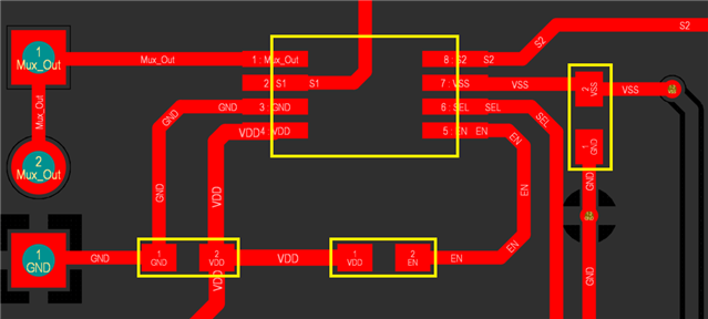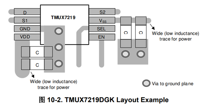 layout 如下所示,输出走线长度有限,是不是S1和S2的输入RC要尽量靠近TMUX7219?或者遵循datasheet中的建议,增大VCC/VSS电容路径?
