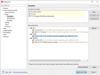 你看一下CCS的window - preferences中是否有如下截图的编译器,型号是你选择的型号: