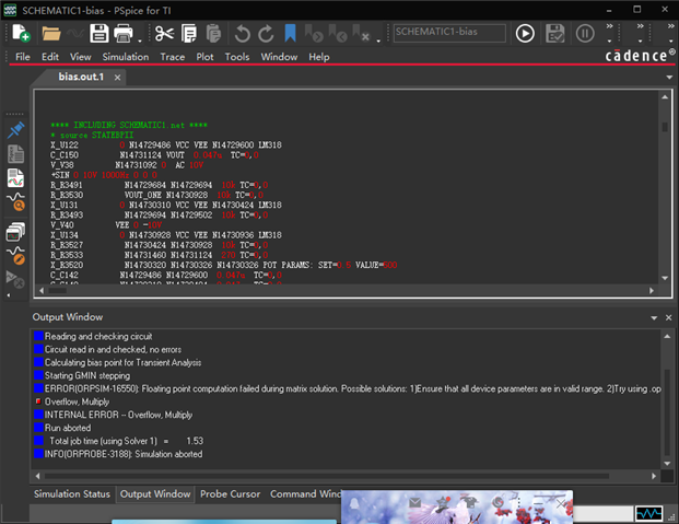 PSPICEFORTI 仿真出现错误,不知道是什么原因,怎么解决?