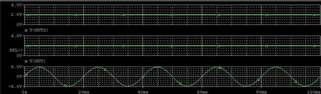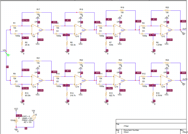 看您输入信号频率是50HZ,而运放同向端是RC高通滤波器,截止频率大概是5.4KHZ,因此输入信号不会通过这个RC滤波器,然后运放就相当于工作在反向比例状态,因此第一级运放输出2V~5V,因为运放单电源供电,最小输出电压是2V左右。