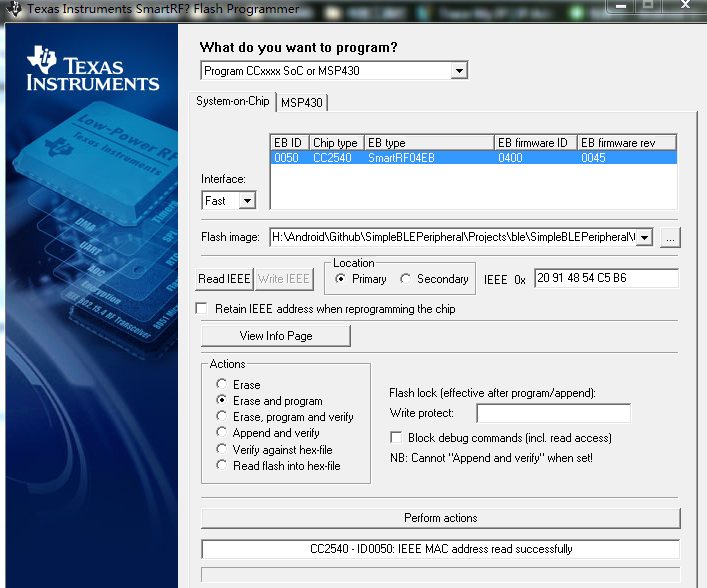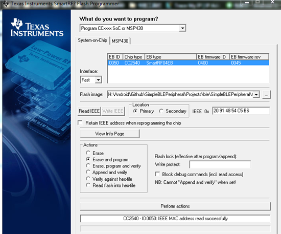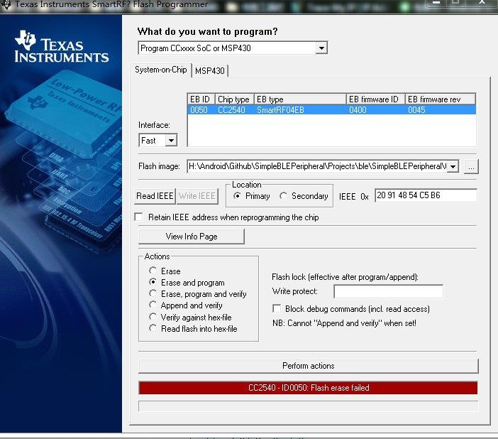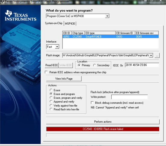 如图,CC2540用IAR调试,下载失败。用SmartRF Flash Programmer也是失败,无法擦除,但可以读取READ IEEE,可以View Info Page。求救TI的工程师什么原因???