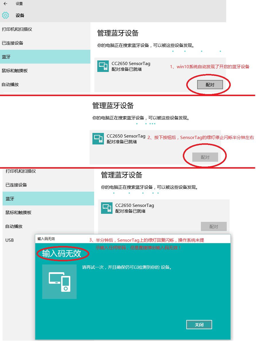 有图:Win10+蓝牙4.0环境,无法通过操作系统连接上CC2650STK,如果有谁连接成功读到数据的请帮忙看看!