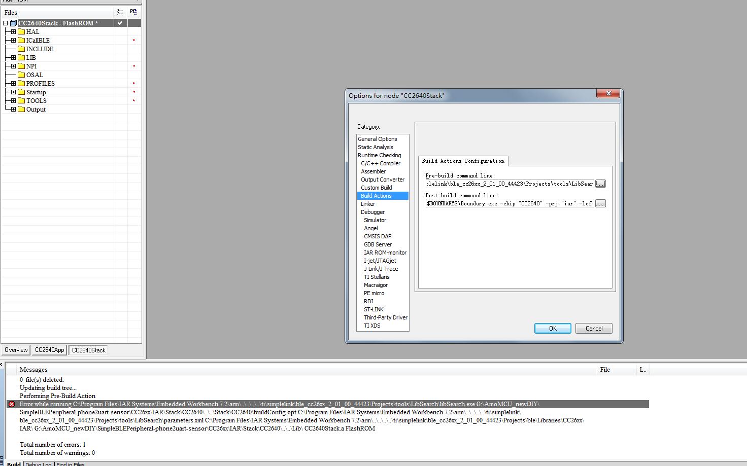 Error while running C:\Program Files\IAR Systems\Embedded Workbench 7.2\arm\..\..\..\..\ti\simplelink\ble_cc26xx_2_01_00_44423\Projects\tools\LibSearch\libSearch.exe G:\AmoMCU_newDIY\SimpleBLEPeripheral-phone2uart-sensor\CC26xx\IAR\Stack\CC2640\..\..\Stack\CC2640\buildConfig.opt C:\Program Files\IAR Systems\Embedded Workbench 7.2\arm\..\..\..\..\ti\simplelink、ble_cc26xx_2_01_00_44423\Projects\tools\LibSearch\parameters.xml C:\Program Files\IAR Systems\Embedded WorkbenchIAR\ G:\AmoMCU_newDIY\SimpleBLEPeripheral-phone2uart-sensor\CC26xx\IAR\Stack\CC2640\..\..\Lib\ CC2640Stack.a FlashROM7.2\arm\..\..\..\..\ti\simplelink\ble_cc26xx_2_01_00_44423\Projects\ble\Libraries\CC26xx\