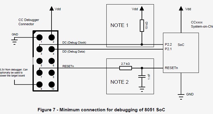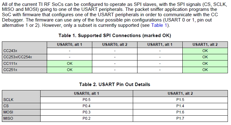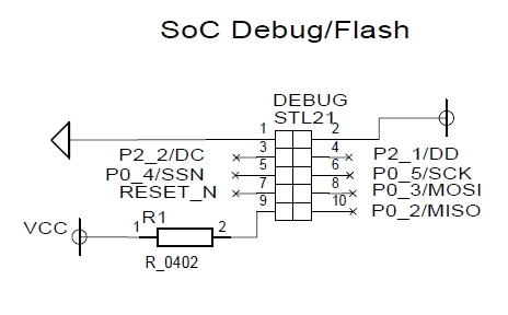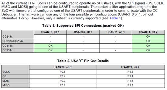 您好,在《CC Debugger User's Guide》(SWRU197H), page10页中,提到 CC Debugger仅支持 CC254X的 USART1,alt2,也就是引脚 P1.4~P1.7,但是 在“CC2540密钥卡参考设计”的原理图中(page3页的 Soc Debug/Flash),连接CC Debugger接口的是 P0.2~P0.5,二者表述冲突,是否有误?谢谢