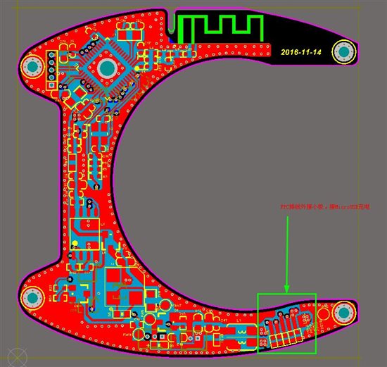 CC2640底下的大孔是为了手焊件方便留的孔。板子尺寸57.5mm*59mm*1.0mm