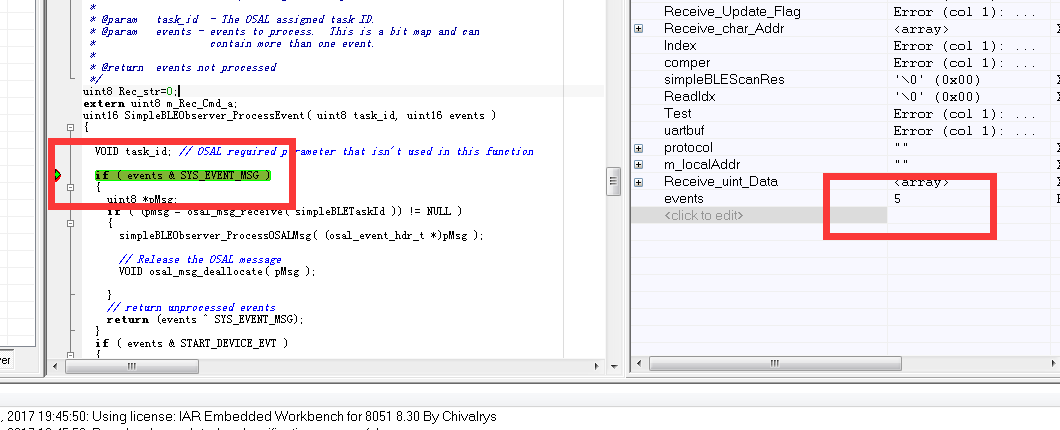 如上图,在相同的SimpleBLECentral目录下打开CC2540中的工程可以编译,调试(对应在CC2540芯片),程序正常,在打开CC2541目录中的工程就出现如下图所示的问题,events事件值一直是5,有没有大神帮我解答一下