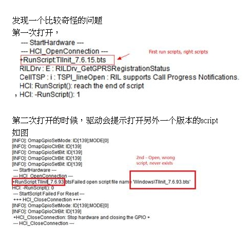 3、我们这里跟踪到的问题是,在蓝牙off之后再对其进行ON操作时,蓝牙模块返回要求的BTS文件名发生改变,和开机获得并加载的文件名不同。如下图。BTS文件没有源码,所以不知道其中发生了什么问题?