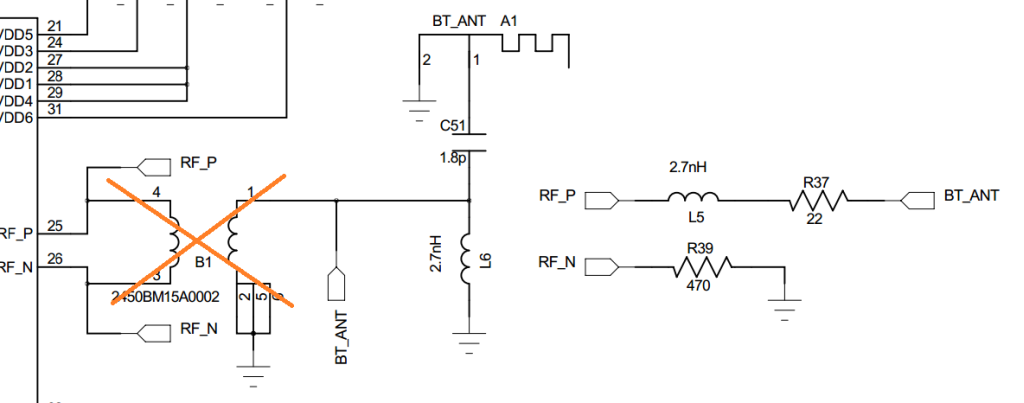 以下是藍牙天線的線路圖. 我們讀卡器的藍牙天線是沒有使用 transformer (eg, B1: 2450BM15A0002).