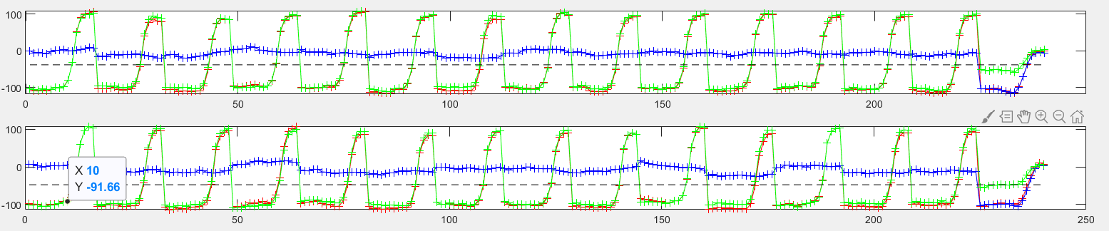 红色的线是根据天线A1.1与天线A1.2(我只使用了两个天线)的IQ数据计算出的角度大约100度(sender放在天线连线1.5m),结果还不错。蓝色的线是频偏造成的角度,需要补偿到结果,绿色的线是补偿后的结果,90-100度左右,但是发现前8-10组数据计算结果稳定,到11-15组的时候,数据明显有问题。