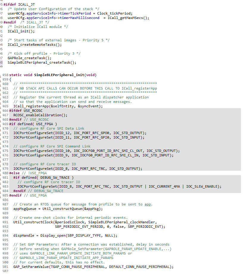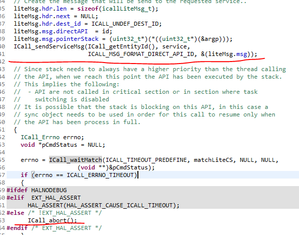 1、使用环境:CC2640R2F,simplelink_cc2640r2_sdk_1_40_00_45。在ble5_simple_peripheral例程中增加了SPI读外接ADC和UART的操作。有时候是正常的,有时候就会进到ICall_abort()中,跟了一下,发现是执行GAP_SetParamValue(TGAP_CONN_PAUSE_PERIPHERAL, DEFAULT_CONN_PAUSE_PERIPHERAL)时,出现了超时,如下图所示。重新上电后可能又正常了,这种现象出现的几率比较高,请问如何解决????