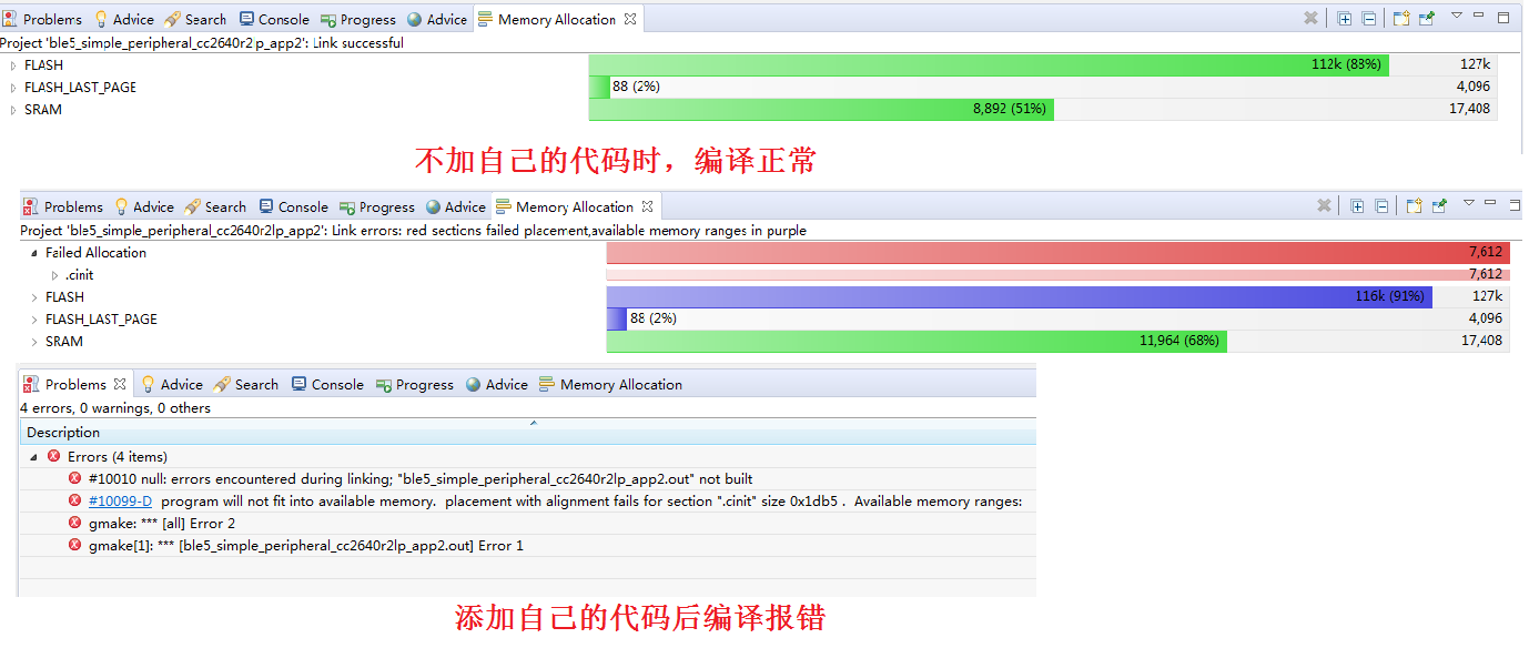 3、目前使用的1.4的SDK,如果使用3.2的SDK,编译ble5_simple_peripheral例程后大约在112K左右(在优化等级4时),加上我自己的ADC和UART代码,编译就会报错,如下图,请问这个问题该如何处理?