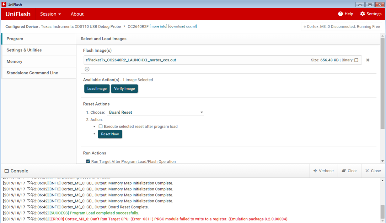 用Uniflash烧录时报错:can't run target CPU:(Error -6311)PRSC module failed to write to a register.(Emulation package 8.2.0.00004)