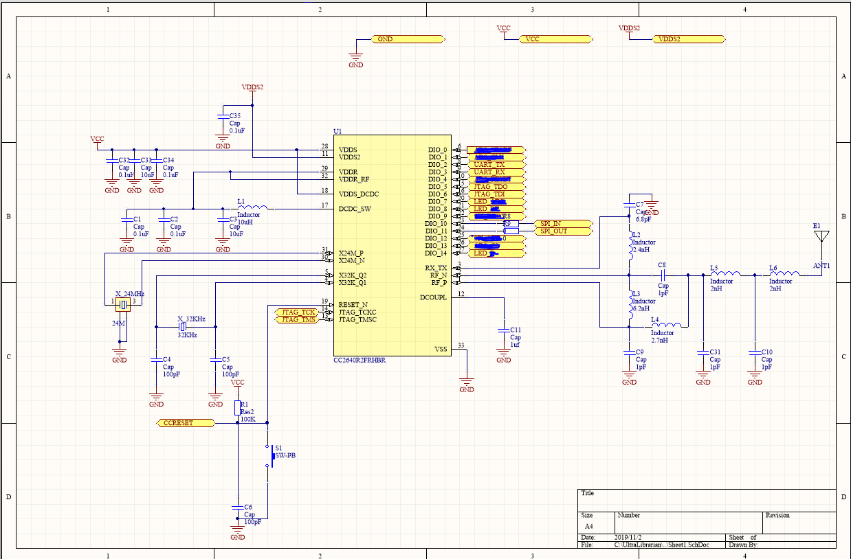 我按照XDS110加了5X2的JTAG口在板子上,因为我不准备使用XDS110供电,所以未接上pin1,只连接了GND、RESET、TMS、TCK、TDI、TDO引脚到芯片。原先觉得可能会用到UART,所以预留了两个引脚接了JTAG的pin3和pin5,但是未用到。