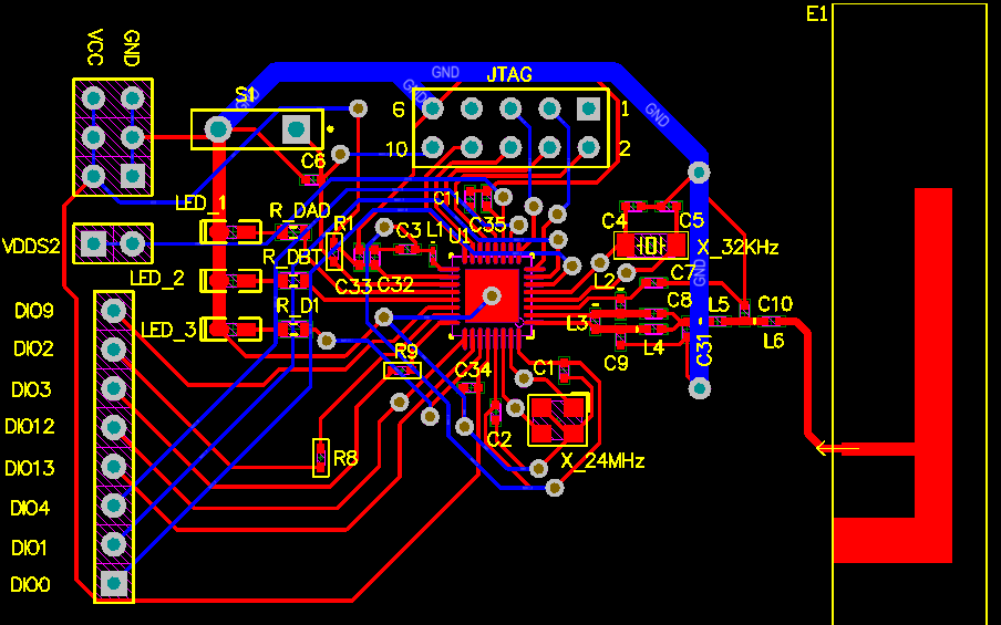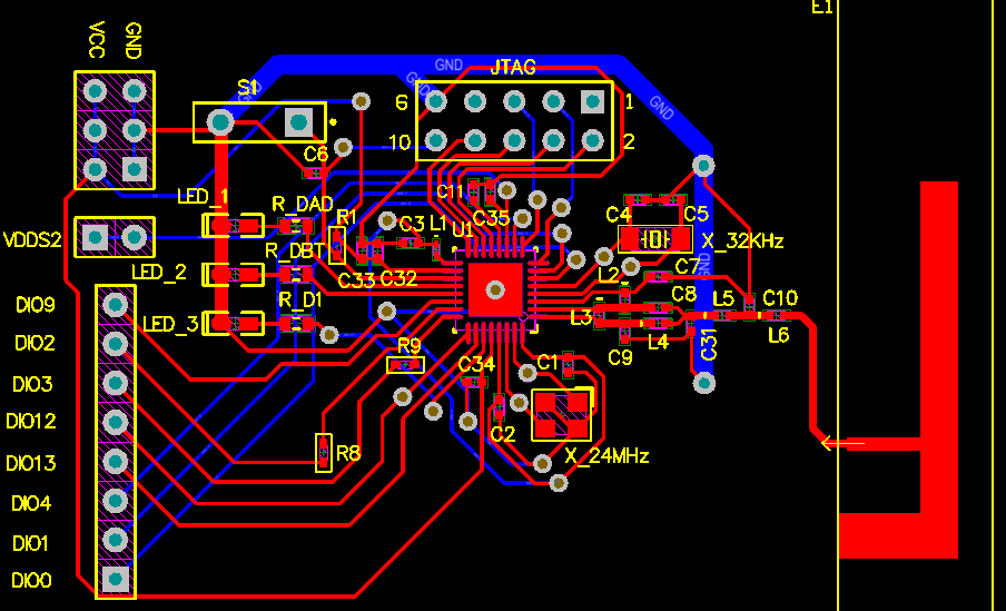 我自己做了一块最小系统板,使用了5X5,32引脚的IC,其中DIO7、DIO8、DIO14接了LED灯,将其余的未用GPIO口引出接到排针上。