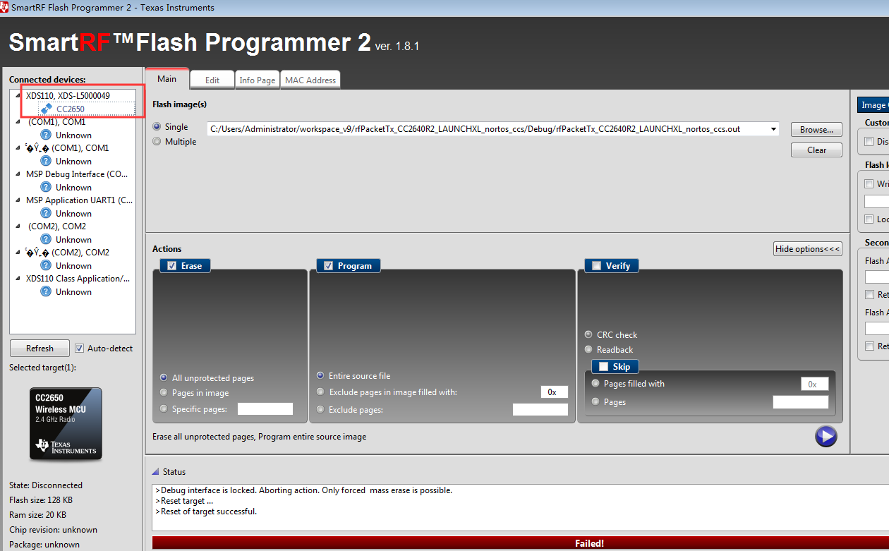 芯片没有变换一直使用同一个芯片,烧写器之前能正常的读出他是CC2640R2F,但是忽然今天一直都把它识别成CC2650,导致没法烧写程序进去