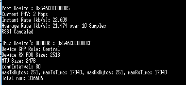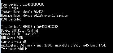 (6)但是当不使用 HOST 来传输透传数据,直接由 CC2640R2F 透传模块采用while循环来发送 1200 KB 字节数据,透传速率可达到 150 kb/s,且无数据丢失。