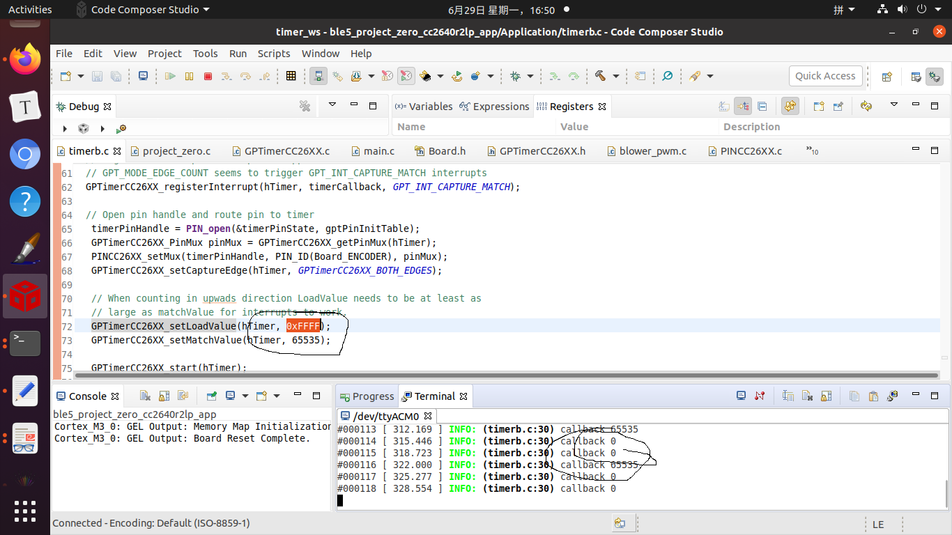 GPTimerCC26XX_setLoadValue(hTimer, 0xFFFF);函数都会触发回调函数吗?我设置的是 GPTimerCC26XX_registerInterrupt(hTimer, timerCallback, GPT_INT_CAPTURE_MATCH);触发回调函数而还在每次调用之后清除计数值,为啥会打印出0,不是要65535才触发回调函数吗?