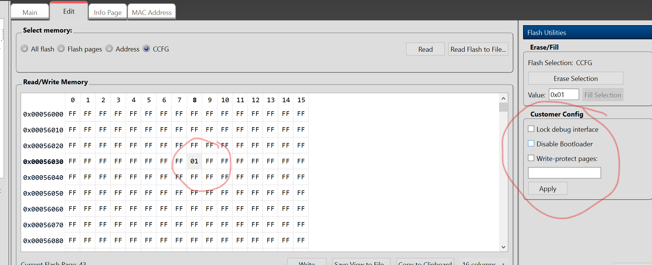 这里有个疑问是,看到上位机的vs代码,有一个对bin文件的大小判断的过程:如果bin文件的大小较大,需要占用的地址超过了ccfg的bootloader相关的配置寄存器的地址,比如cc26x2的flash为352KB,0x0005-7FD8地址开始存有bootloader相关的寄存器配置内容,如果bin大小覆盖了这个值,就会修改相应ccfg的寄存器的数值是吗?也就是说bootloader相关的配置寄存器实际可以通过某种方式人工修改,而非只能通过IDE比如ccs debug的时候配置.cfg文件再烧写进去,不知道这样理解是否正确?