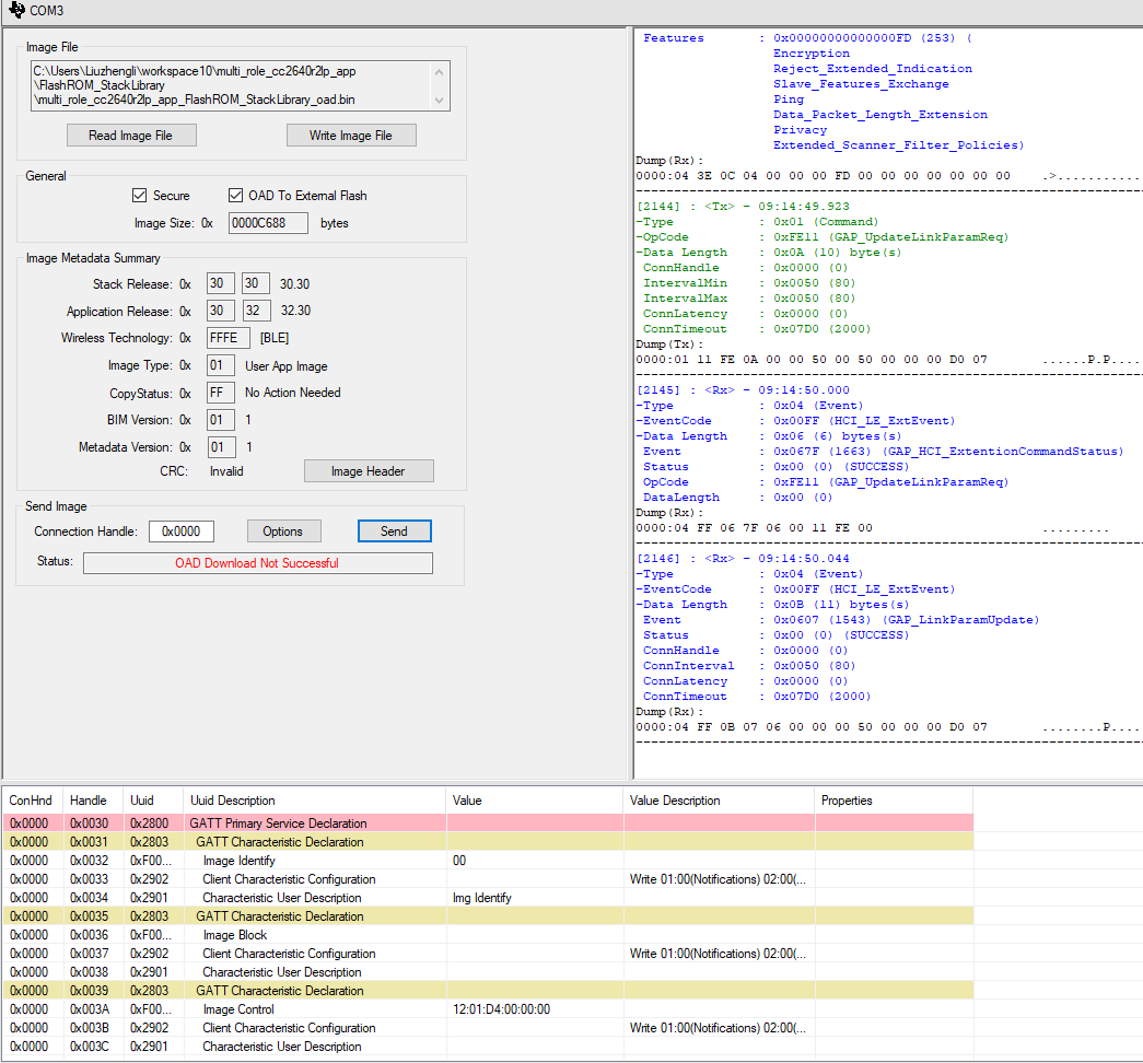 您好,我按照file:///C:/Users/Liuzhengli/Desktop/simplelink_academy_cc2640r2sdk_4_20_03_00__win/simplelink_academy_cc2640r2sdk_4_20_03_00/modules/blestack/ble_enhanced_oad/ble_enhanced_oad.html中提供的在Multi Role例程中添加了OAD,编译成功后,我通过BTool 想进行升级,是在已经烧录 simpleperipheral片外OAD的板子上,但是升级失败,请问是什么原因,可以提供帮助吗,我不知道哪儿出错,谢谢