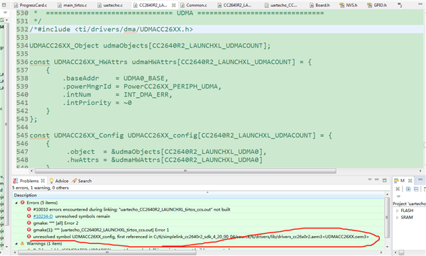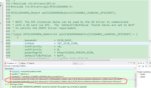 我用的CC2640R2F,SDK版本换成V4.2后编译SRAM变大了,我们要减少,然后屏蔽一下驱动没有用的,比如说SPI我们没有用到,但是屏蔽到了编译有这个错误这么解决?我们想把SRAM减小到58%左右,屏蔽CC2640R2_LAUNCHXL.c中的,例如屏蔽没有用到的SPI会有这个错误,怎么解决,我们自己用的变量并不多。我们用到的ADC、串口、内部FLASH和普通IO,需要去掉一些没有到的去减小SRAM