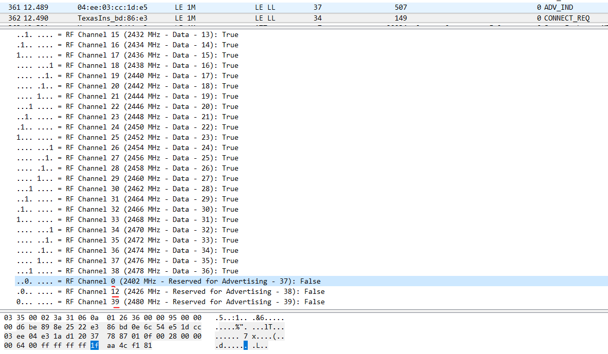 默认情况下,这40个信道全部可以使用,我每次用wireshark 抓取到connect_req 的channelMap 是0x1FFFFFFF,