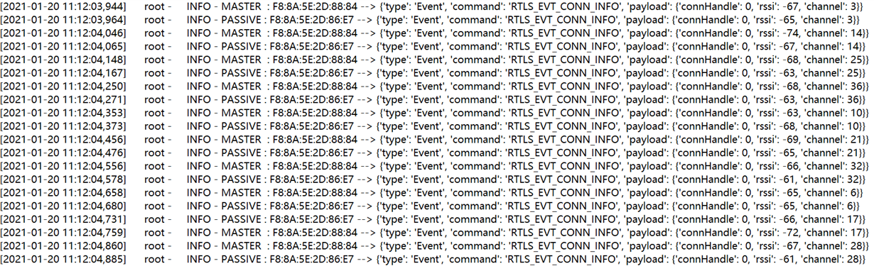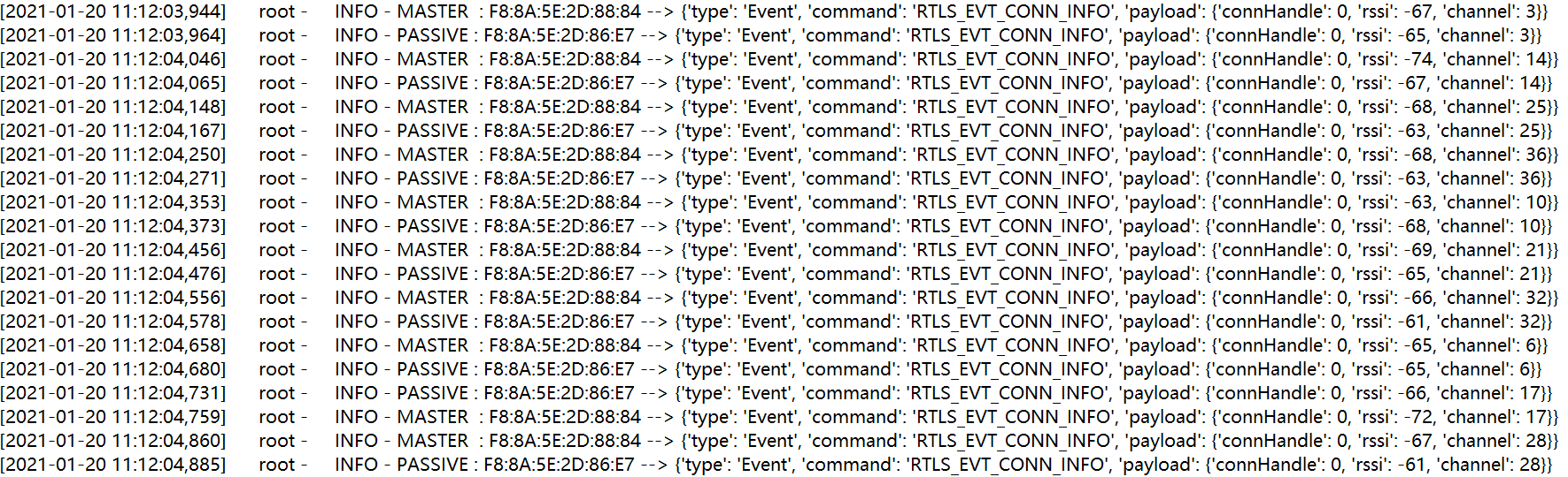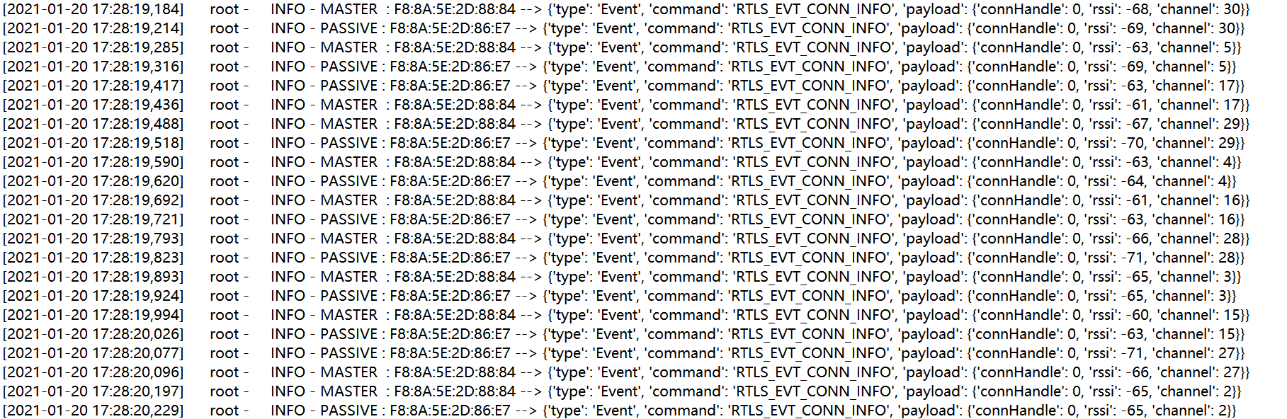 您好,您可能没有明白我的问题。我现在想通过执行python脚本导出相位差和角度值,我运行了rtls_aoa_multi_conn_example.py脚本,里面的参数默认是AOA_MODE_ANGLE,理论上是可以导出angle值的,但是运行后却只有如下的数据,没有我想要的angle值。