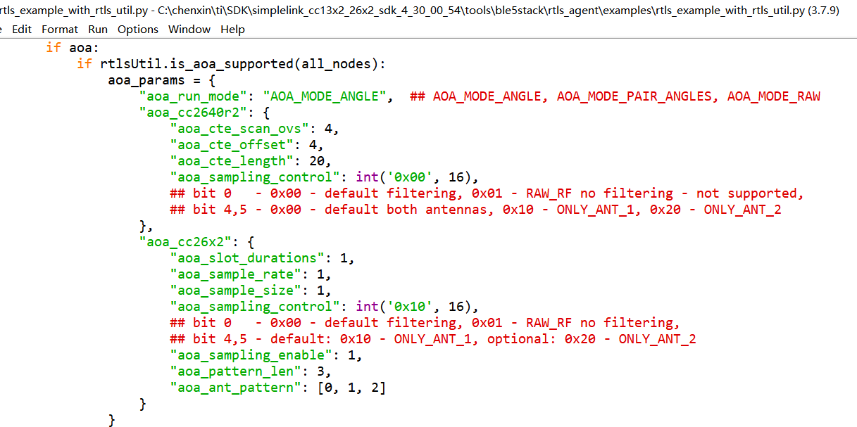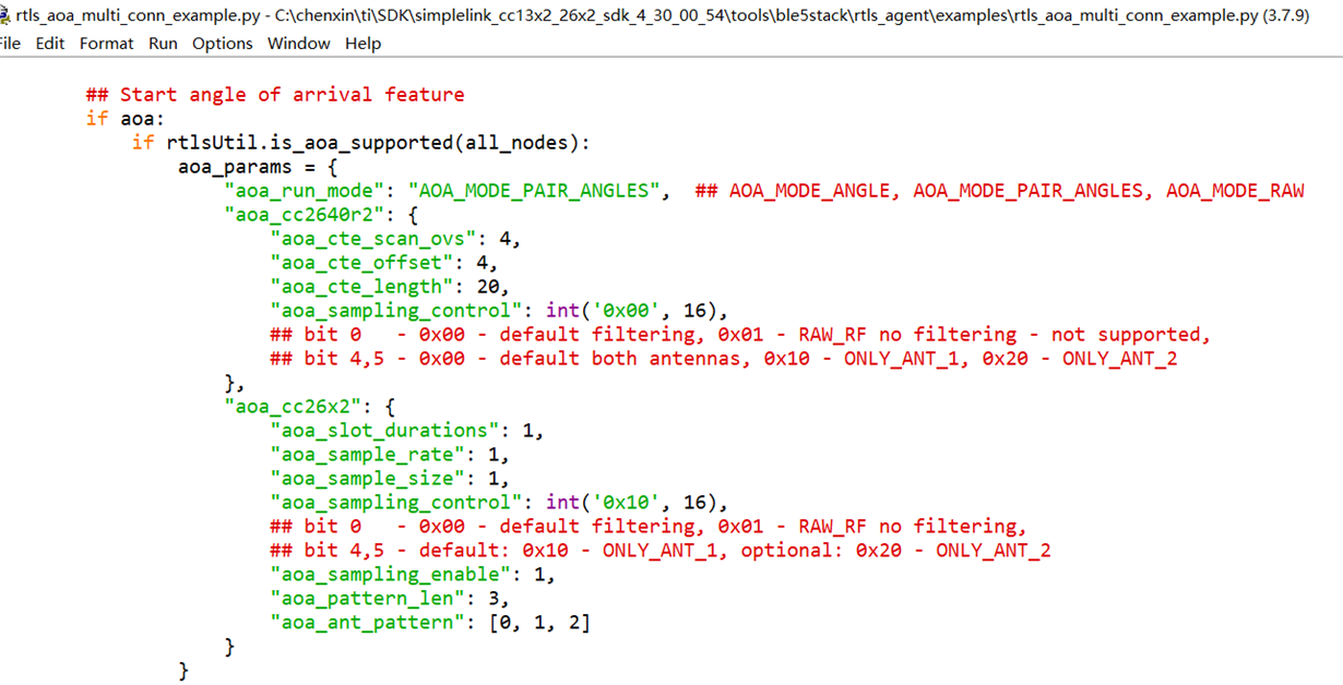 Kevin Qiu1 说:我没有用rtls_aoa_multi_conn_example.py测试过,这个是有多个从机,你可以用rtls_example_with_rtls_util.py,里面默认也是AOA_MODE_ANGLE,按照上面链接中步骤,设置好COM口,另外注意For rtls_master, when bit[0] for sampleCtrl= 1, AOA_MODE_PAIR_ANGLE and AOA_MODE_ANGLE are not supported.