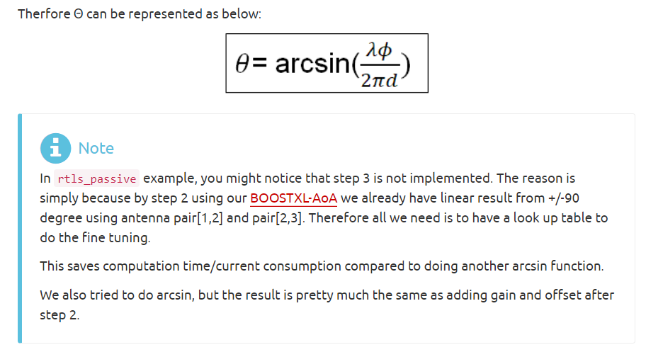 我在指导链接中看到,TI最终没有选择通过arcsin的方法计算到达角,而是通过查表补偿的方法,但是使用了arcsin也取得了一样的测量效果。所以对此想请教下关于式中的波长和天线间隔参数,TI是如何选取的?