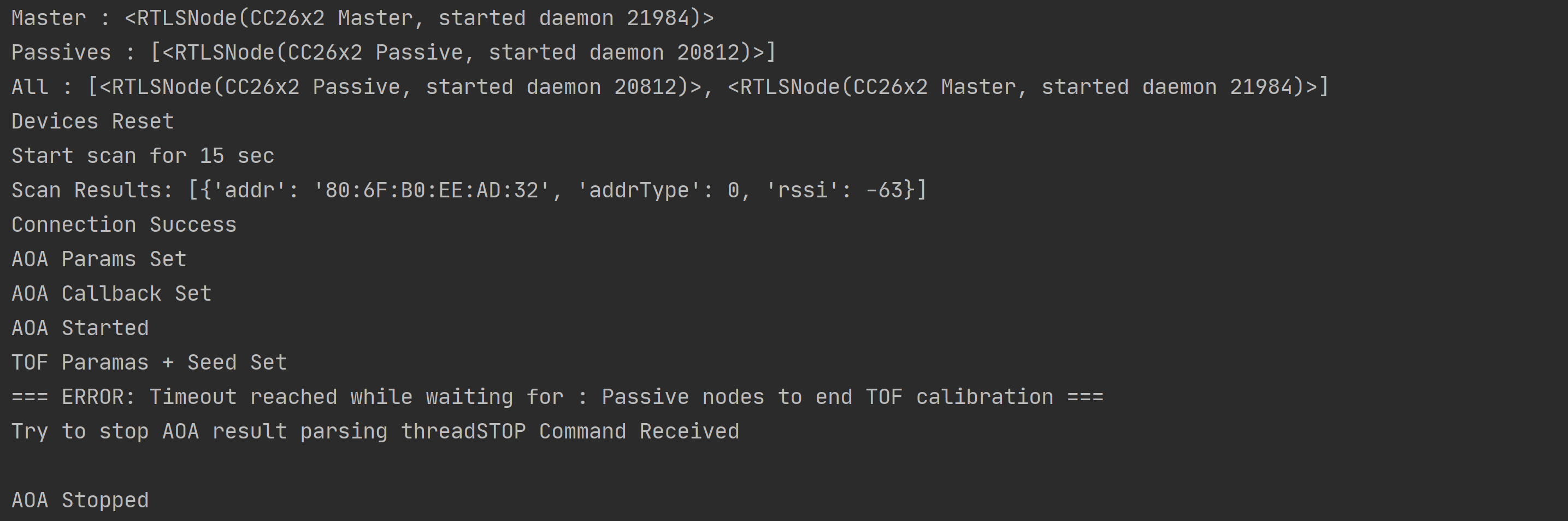 我尝试使用SDK3.40运行ToF演示(AoA与ToF同时运行)。我将BOOSTXL-AoA放置在Passive上,Master使用固有的天线。Slave作为目标设备。在单独运行AoA功能时一切正常,但是我启用ToF功能后一直报错如下提示:
