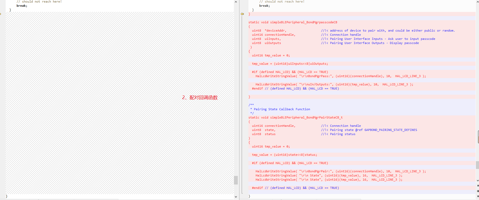 测试结果:当注释掉配对回调函数(该回调函数用于打印调试信息)之后,现象和官方测试例程中现象一致,第一次配对完成之后,需要断开连接,再重新连接,之后就正常了。