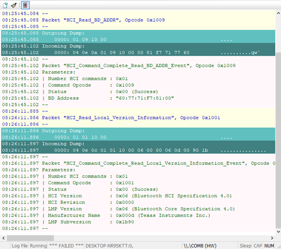 我用两个TTL串口分别与CC2564和WL1831相连,在HCITester上也已经加载了对应的xml文件,可以使用指令获取到一些简单信息,例如HCI_READ_BD_ADDR(opcode 0x1009)等。目前想将这两个芯片蓝牙建立起连接,然后做一次简单的发送数据接收数据动作,用来验证模块天线是正常的。请问需要怎么实现?COM8是CC2564, COM20是WL1831.