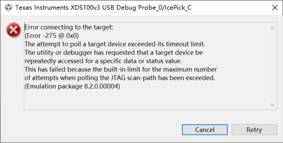 使用XDS100V3下载器,只连接下载器的VREF 、 TMS、 TCK、 GND这四个引脚到板子上,下载时遇到如图属实问题,请问是硬件连接的问题还是软件配置下载参数的问题,谢谢