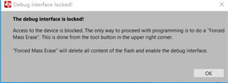 >Debug interface is locked. Aborting action. Only forced mass erase is possible.