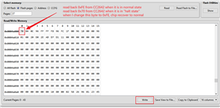 更进一步,我发现关键的地方,是在0x4A000地址的一个字节。这个字节在正常工作的芯片中,读取的值是0xFE;而在无响应状态下,读取的值是0x70