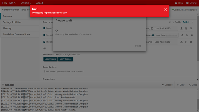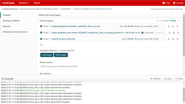 我按照文档编译了cc26x2r1lp_bim_onchip 、simple_peripheral_CC26X2R1_LAUNCHXL_tirtos_ccs、simple_peripheral_oad_onchip_CC26X2R1_LAUNCHXL_tirtos_ccs 三个工程,请问这三个镜像怎么烧写?我用UniFlash烧写,如图