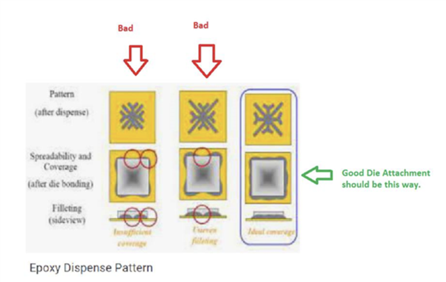 The parts epoxy fillet formation around the silicon die is acceptable base on the size of the silicon die versus the Die paddle. Manufacturer use the cross or double pattern to prevent the epoxy to overflow on the die paddle. Due to the parttern of the epoxy on the die paddle, when the Silicon die is put on the die paddle it will result to this spreadability and coverage for epoxy on the silicon die,