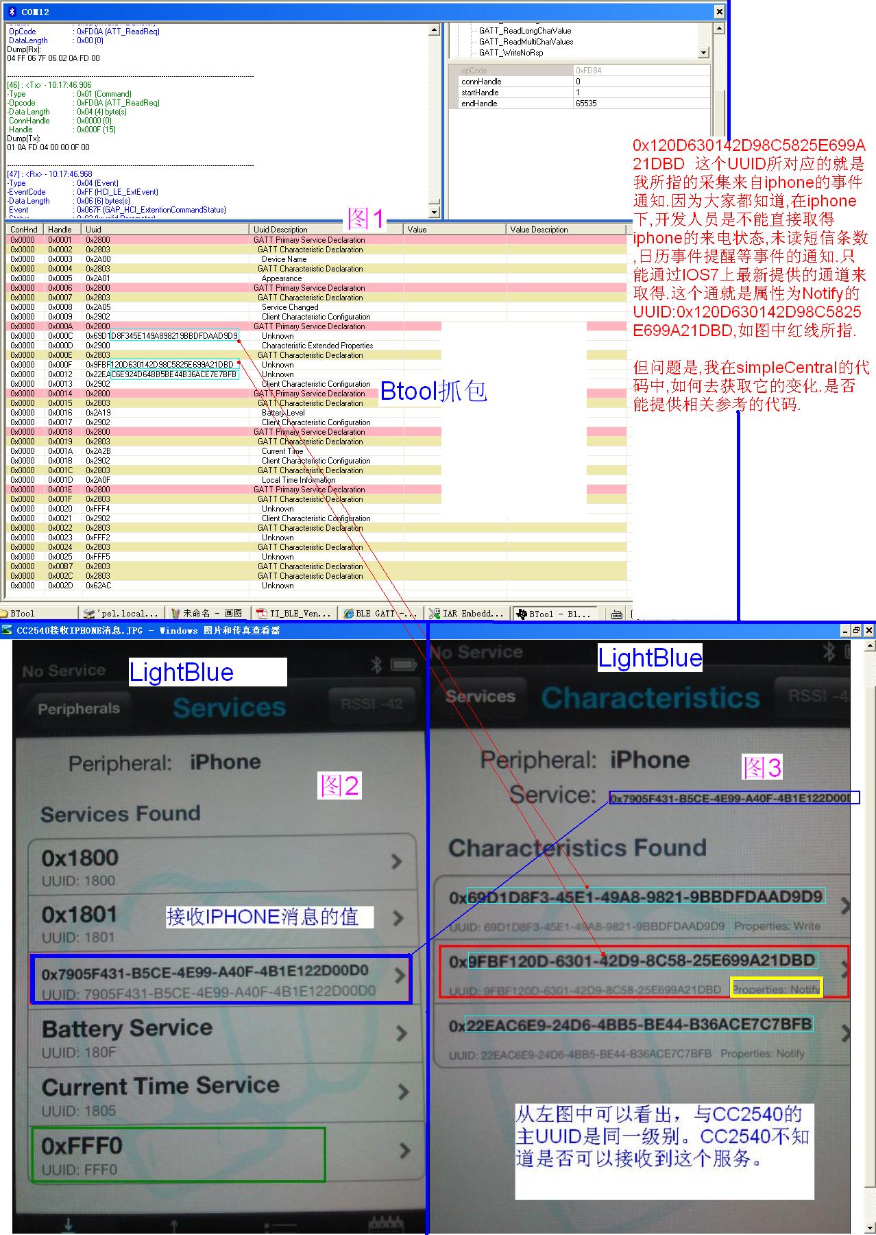 各位大虾,我现在正在做一个项目,这个项目是CC2540做主机.它需要去搜IOS7的所有UUID.其中包括苹果公司在IOS7上新增的蓝牙通知的服务.这个服务是向与IPHONE联接的主机发送有关于 日历/来电/邮件/短信 事件通知的.我用一台装有LightBlue软件的IPHONE(LightBlue模拟主机),去找装有LightBlue(模拟从机)的另一台IPHONE,发现,发送日历/来电/邮件/短信 事件通知的服务UUID与FFF0是在同一级上.所以,我之前用FFF4(NOTIFI)去接收是没有响应的.可能需要查找到所有的service UUID,并找到日历/来电/邮件/短信 事件通知的service UUID再进入下一级,用它的NOTIFI功能来接收通知.