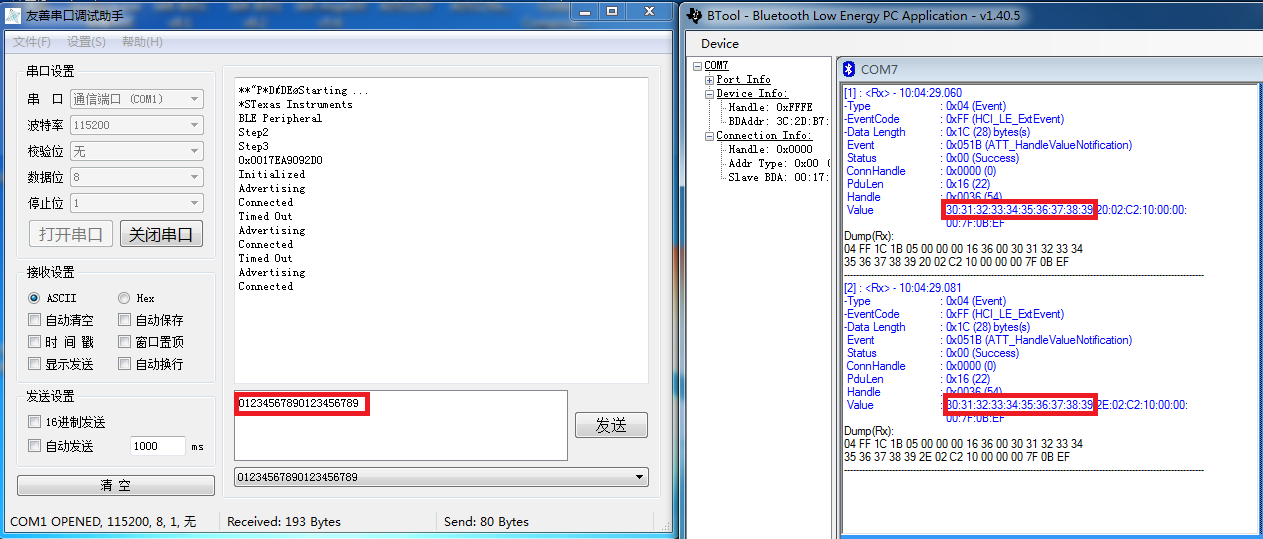 原因是2540用DMA接收串口数据时,将01234567890123456789这20B数据分两次接收了,然后就出现蓝牙发送两次数据包的情况?但是这20B数据不通过蓝牙发送出去,而是通过串口发回到PC,回显正常的。如果PC发送数据给2540的速度太快,回显也会有少量的乱码。