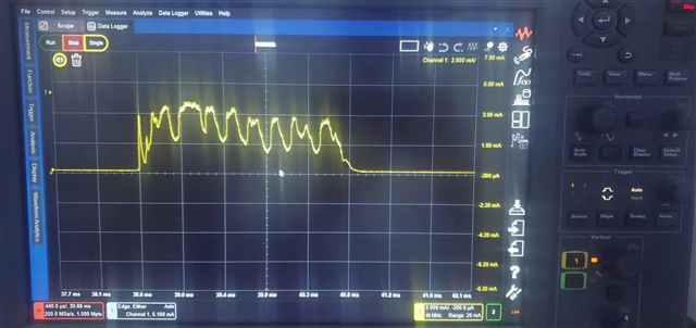 上图是定时器事件未做任何处理的波形,定时器的工作时间接近了3ms,电流达到了4ma左右。