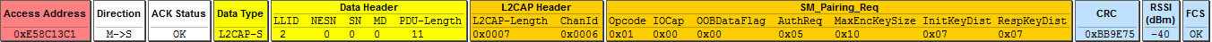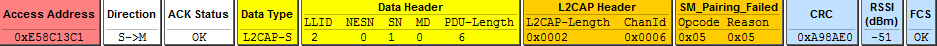 我使用协议栈的Central例程,使能配对之后,打印输出为配对失败,使用抓包工具获得失败的包如下: