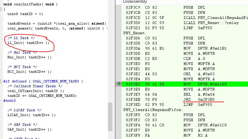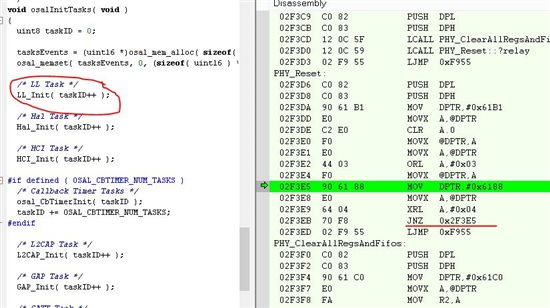 改simpleCenter例程,是基于CC2540芯片的,但是程序写入后运行在协议栈LL_Init(taskID++)函数里出不来,这时电流变大,大约9mA(包括母板电流)。