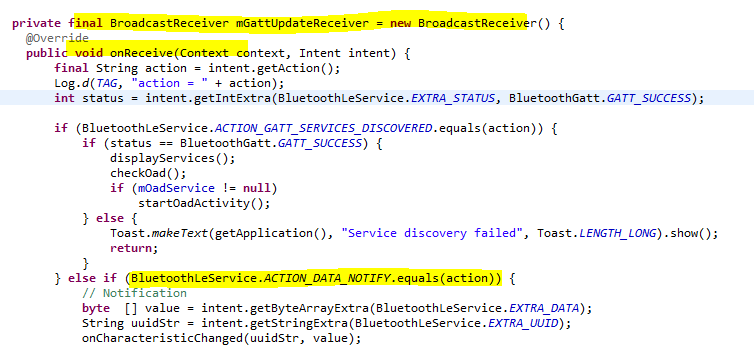 如题,GATT_Notification的parameter2(attHandleValueNoti_t),设定的值(attHandleValueNoti_t.value),在android蓝牙中怎么接收呢?