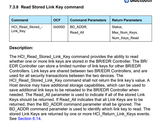 但是在蓝牙标准官方提供的Bluetooth Core Specification 5.2中可以看到相关Link Key的内容。比如Read Stored Link Key command: