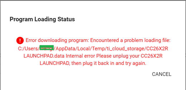 新买的LAUNCHXL-CC26X2R1板,板上信息BOM Rev:C、FW:SDK3.40 2303,按照Getting started with the CC26X2R LaunchPad指引在https://dev.ti.com/tirex/explore/node?devtools=LAUNCHXL-CC26X2R1&node=A__AOhWCvEMSJlyxXbKsikrYw__cc26xx_devtools__FUz-xrs__LATEST下执行Restore the out of box experience,点击黑色的"CC26X2R LANUCHPAD"按钮,绿色进度条完成后弹出Downloading Program...对话框,之后又弹出Downloading Program into CC26X2R LANUCHPAD...,随后弹出错误提示如图,试了两台电脑、三个浏览器(chrome 113.0.5672.127、firefox 113.0.0.8524、Microsoft Edge 113.0.1774.50)均是同样错误。请帮忙解决,谢谢。