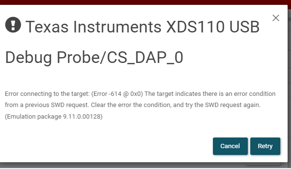 该问题很可能是因为在烧写的程序中禁用了调试访问(在 ccfg 内部)。这可能是由硬件/软件不匹配引起的(即在RevB/PG2板子上运行RevA/PG1 SDK示例或者RevA/PG1 ccfg在RevB/PG2示例中并烧入RevB/PG2板子)。由于只有revision b (PG2.0) 适用于SIMPLELINK-LOWPOWER-F3-SDK